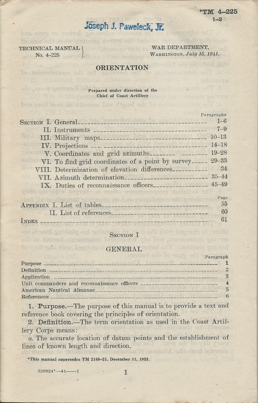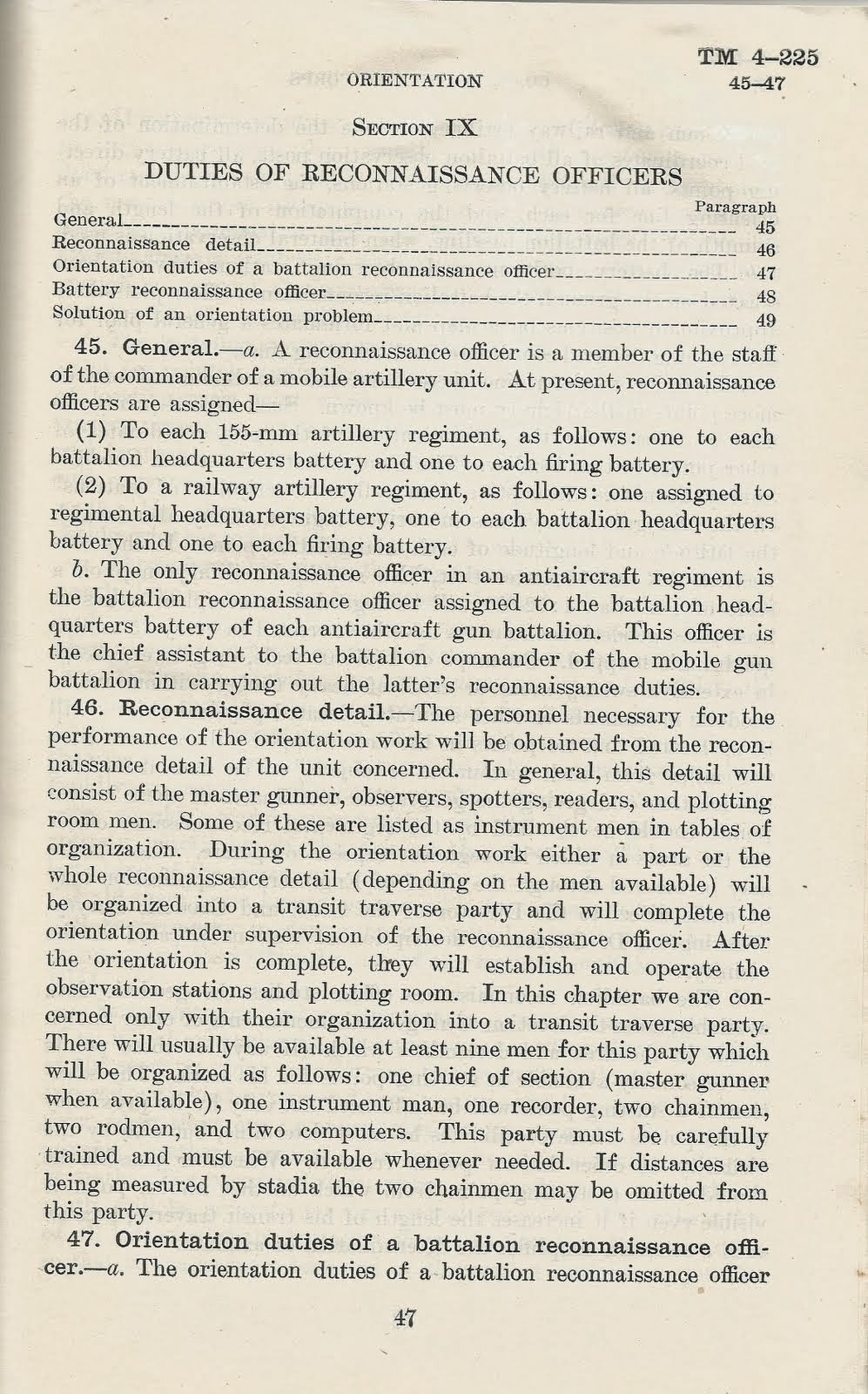 Modern field artillery has always had a strong need for surveyors. As the concepts of indirect artillery fire matured and rifled cannon delivered the ability to fire projectiles far beyond the visual range of the gun crews the need for surveyors to accompany and support field artillery units emerged. After all, to accurately hit a target you can’t see you first have to know precisely where you are. Many of the concepts covered in this little manual are directly applicable to field artillery survey. But we are talking about field artillery – guns that get towed around the battlefield by trucks, set up, shoot some shells then pack up and move to the next firing position. Coast Artillery is a different beast. It operated large, permanently placed guns overlooking harbors and waterways that were already precisely mapped. Why the need for more advanced surveying and mapping techniques? The answer is laid out in Section (Chapter) IX of the manual, where it discusses the duties of the Battalion Reconnaissance Officer.