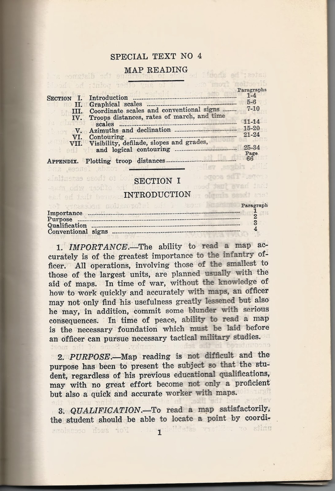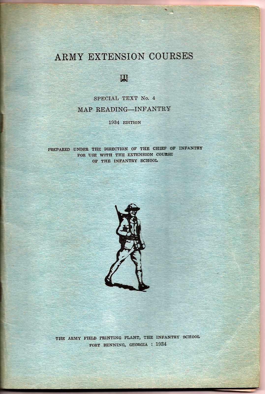 Between the wars the Infantry School at Fort Benning concludes that map reading is an important skill that needs to be simplified and standardized for presentation to the common Soldier. In 1934 they publish a map reading pamphlet as part of the Infantry extension course that presents map reading with a level of simplicity and clarity not seen in other map reading texts. This pamphlet is perhaps as close to a standard map reading manual as the Army develops prior to 1938.
