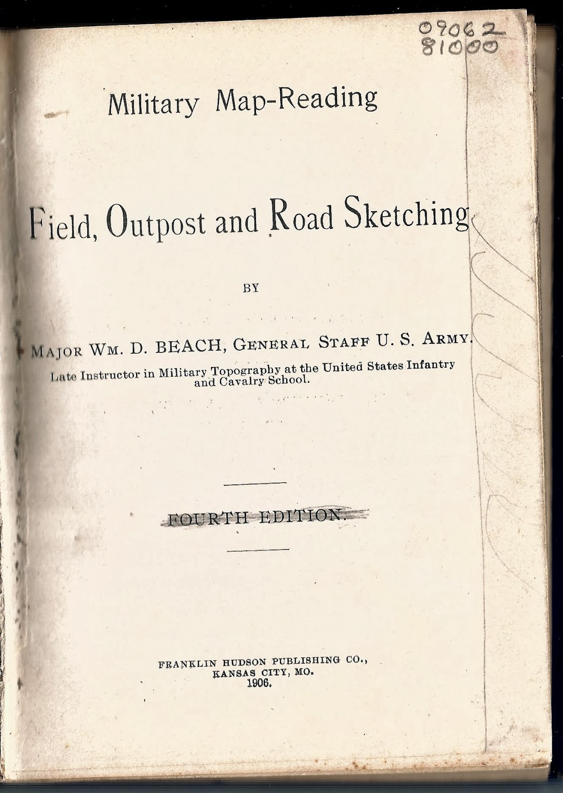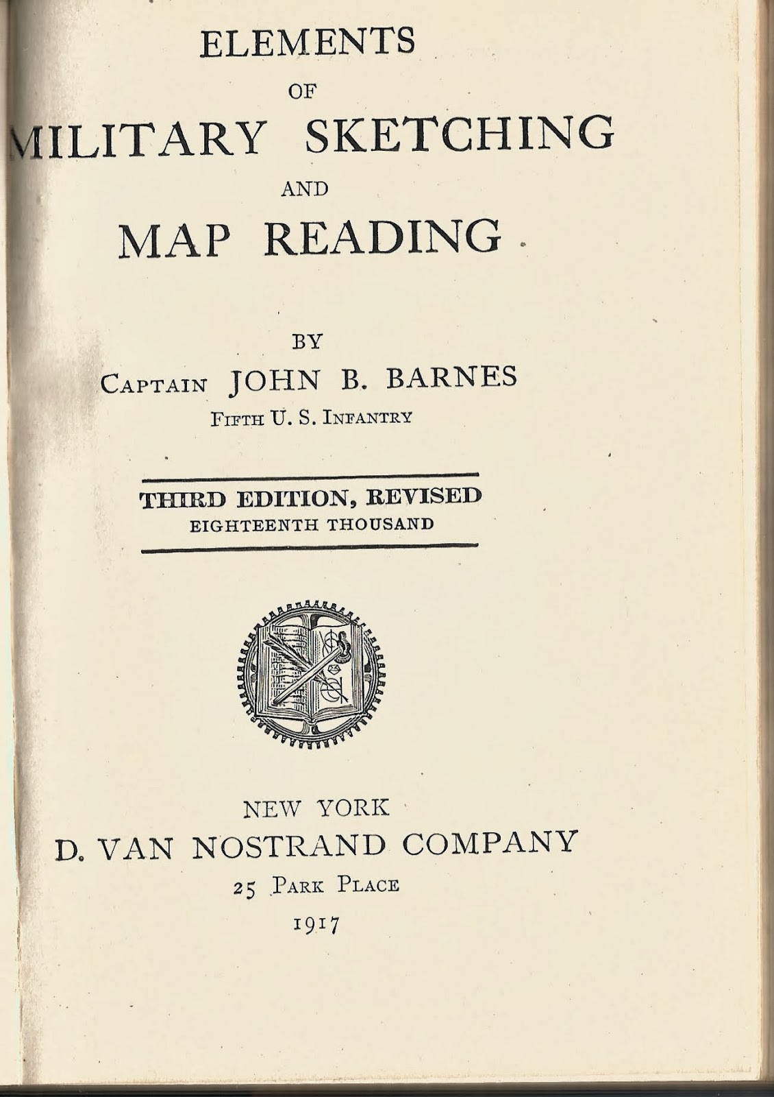 Starting in the early 1900’s and carrying on right up to just before WWI a number of private publications appear that deal specifically with military map reading, land navigation and field sketching. In this period field sketching is considered as important as map reading, and for good reason – military maps as we think of them do not yet exist and a unit has to quite literally map its own way to battle. Titles such as ‘Military Map Reading; Field, Outpost and Road Sketching‘ (1908) by Major William Beach, ‘Elements of Military Sketching and Map Reading‘ (1917) by Captain John Barnes and ‘Military Map Reading‘ (1909) by Captain C.O. Sherrill seem to have filled a recognized need for a dedicated map reading manual. In fact, Sherrill’s book was adopted by the Army Service Schools at Fort Leavenworth as a standard instructional text. I’m sure copies of these books found their way into the haversacks of hundreds of Regular Army, National Guard and state militia officers.