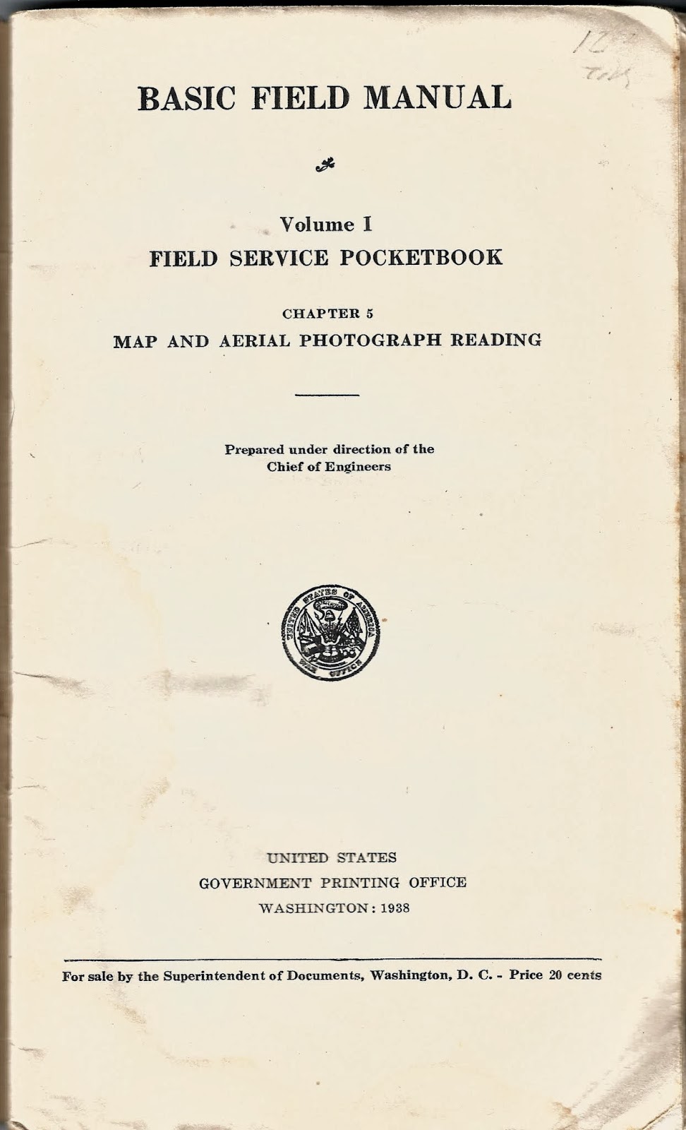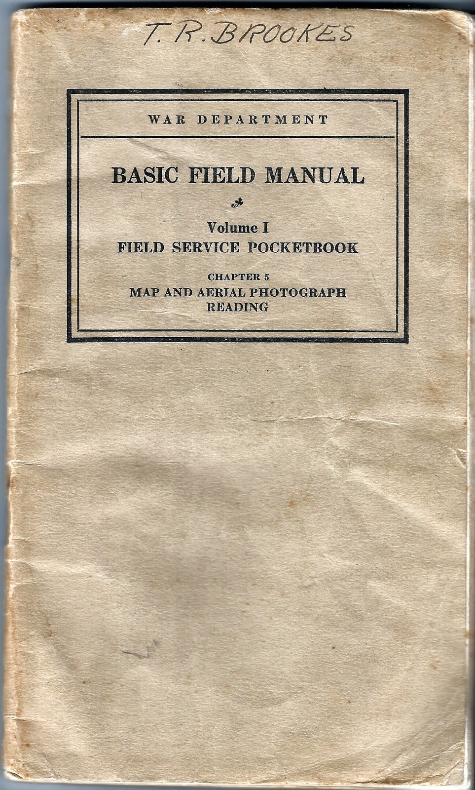 But the Army still considers map reading an Engineer skill. The Infantry School may have written a crackerjack manual for its own use, but the job of writing a manual for the entire Army falls to the Engineer School. In 1937 they get the job and the first dedicated Army publication that deals with map reading is issued in April 1938. It is titled ‘Basic Field Manual, Volume 1, Field Service Pocket Book, Chapter 5, Map and Aerial Photograph Reading‘.