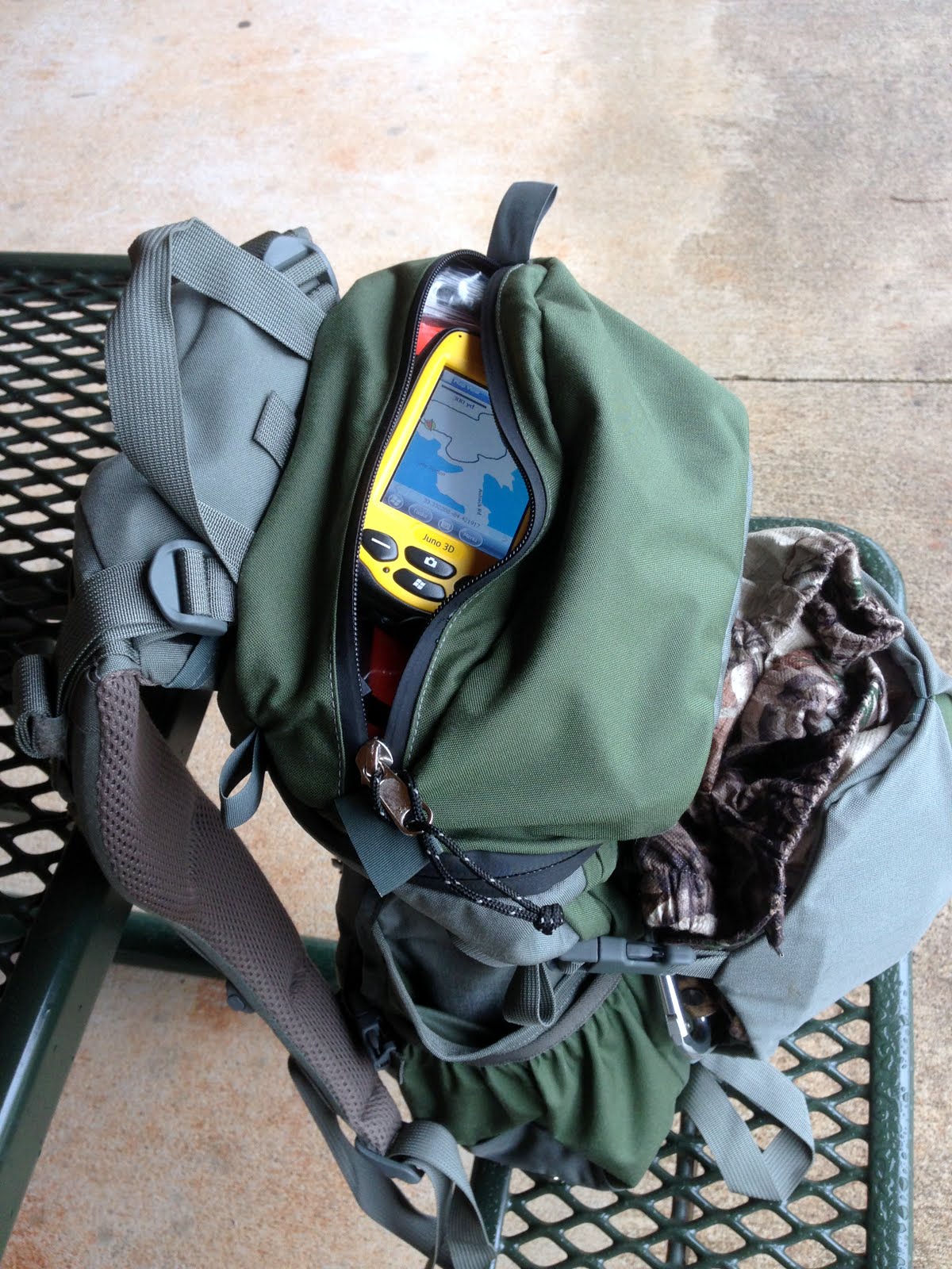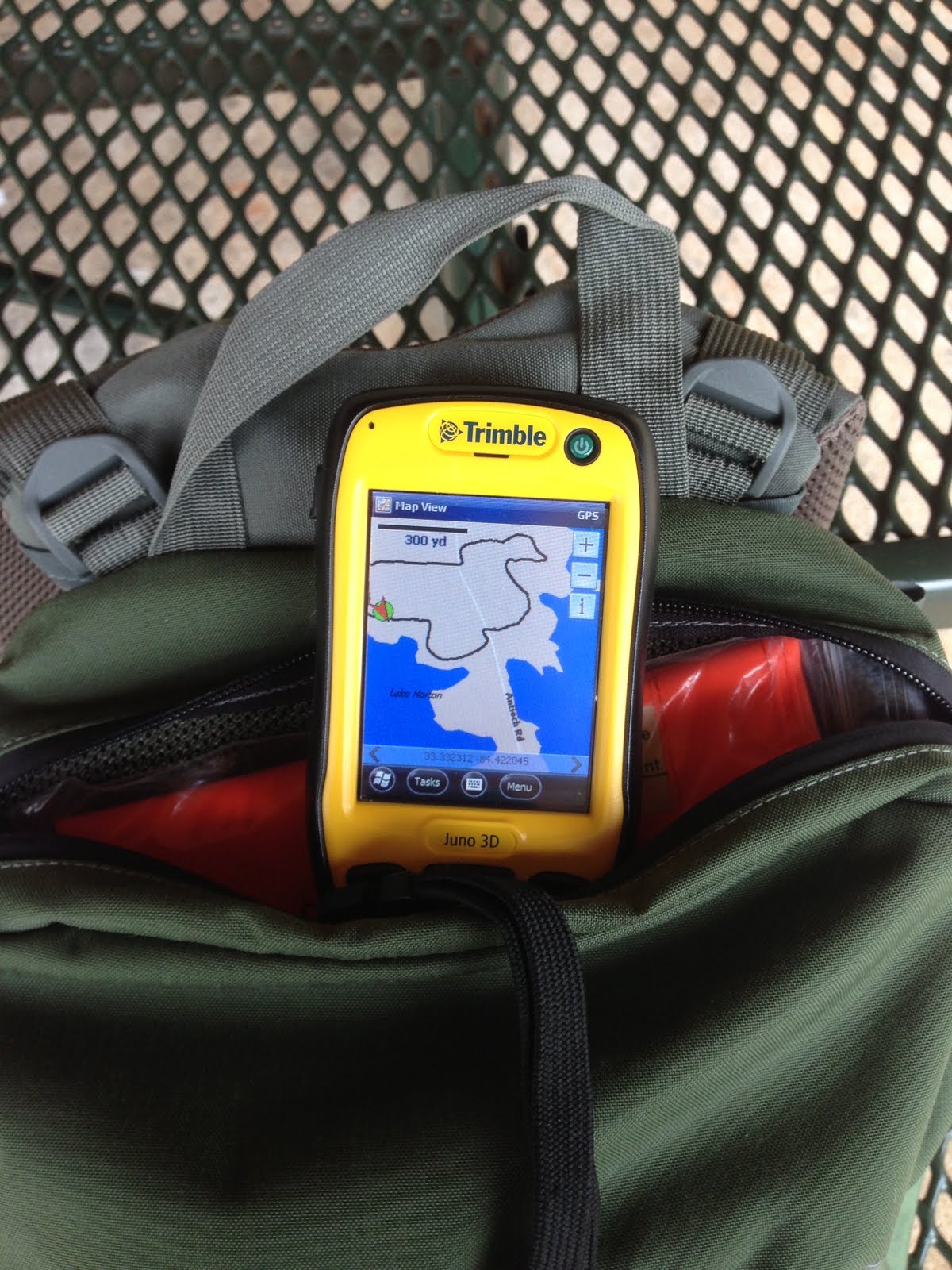 At the end of the hike I pulled the Juno out of the bag and realized I didn’t need all the fancy gadettry I was dreaming up.  The Juno did just fine collecting data while sitting snugly inside the rucksack lid.  It’s not a perfect setup by any means; the GPS signal still has to penetrate the bag material and my big fat noggin’ blocks a lot of the signals, and it’s impossible to stop collecting streaming GPS data to collect point data.  But for hikes like these where I’m just after trail alignments it works fine.  The Juno isn’t a survey-grade instrument anyway so some GPS track shift is to be expected, particularly under heavy tree canopy.