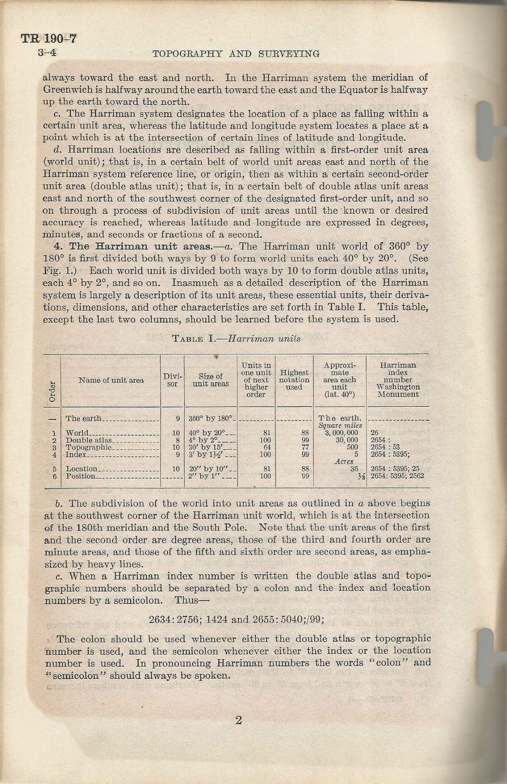 “It should be realized that the Harriman index system is in no sense a method of map making or of chart building; still less is it a new system of projections.  It is merely a simplified system of using an established arrangement.  It may be used on any map or chart, regardless of projection or scale, provided the longitude and latitude of the southwest and northeast corners are available or can be determined by scaling on the map.  Since only arabic numerals are employed in location designation, this system is capable of use in any language.”
