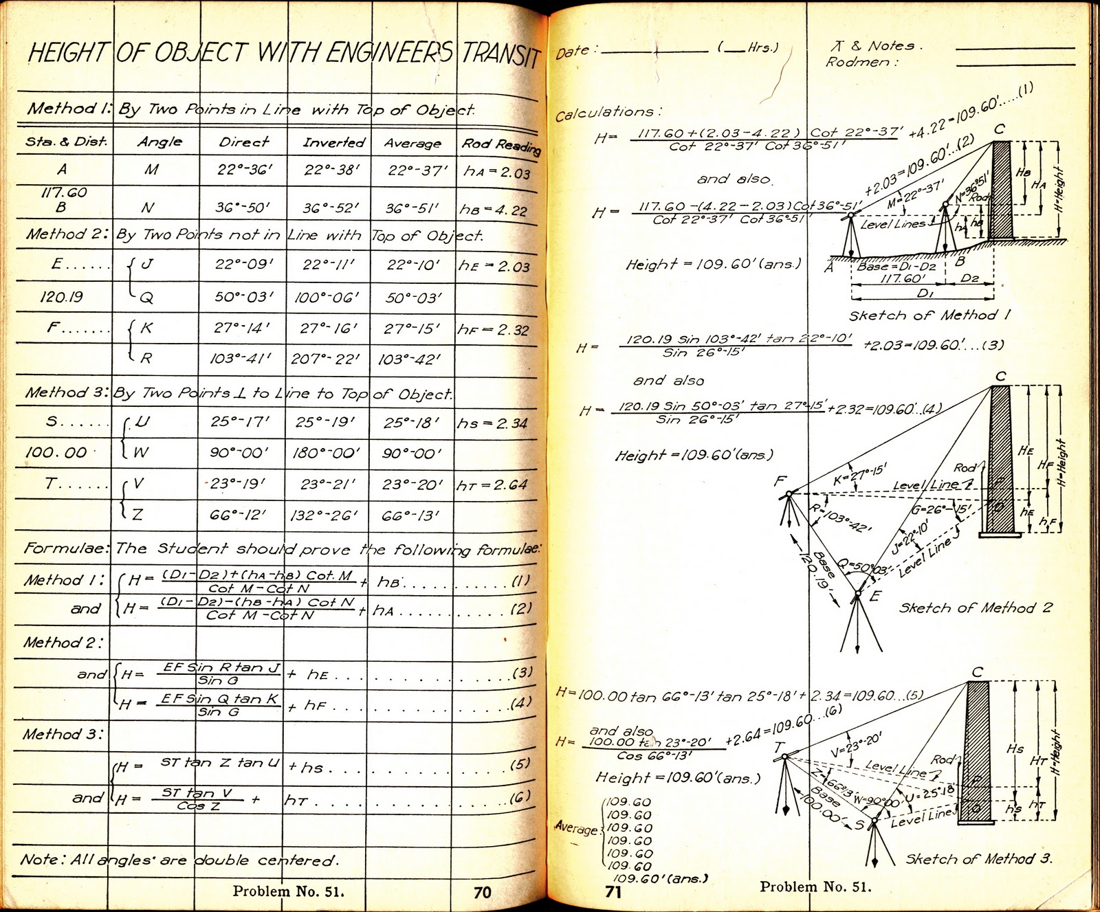 But since this is my blog and I love old stuff, particularly old stuff that still has relevance, we’re going to take a trip back to the 1950s. A time when cars had carburetors, space travel was the stuff of science fiction and real men did surveys with optical theodolites and steel measuring tapes, and wrote everything down in hard bound notebooks. A couple of professors at the University of Missouri put together a course in introductory surveying and field measuring. A large part of the class involved proper field note recording. This course was to serve as the foundation for all surveying and civil engineering instruction to come, so the instructors needed to make sure the students got started on the right foot with disciplined, accurate, structured and comprehensive field data recording. The two professors, Clarence Bardsley and Ernest Carlton put together a gem of a book titled ‘Surveyors Field Note Forms’.