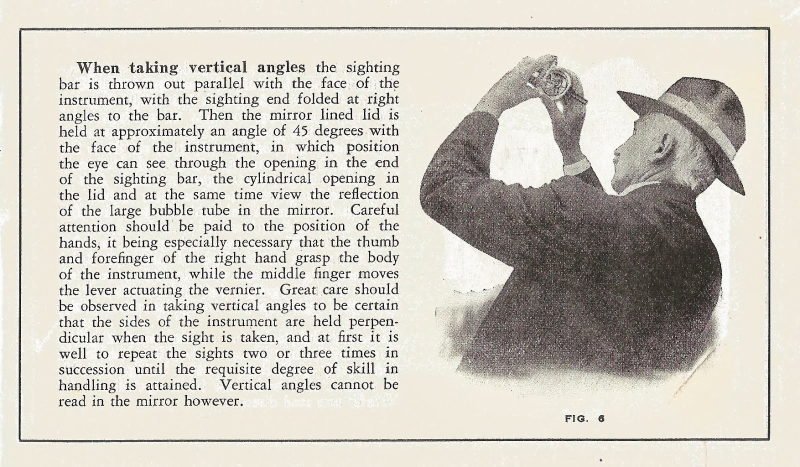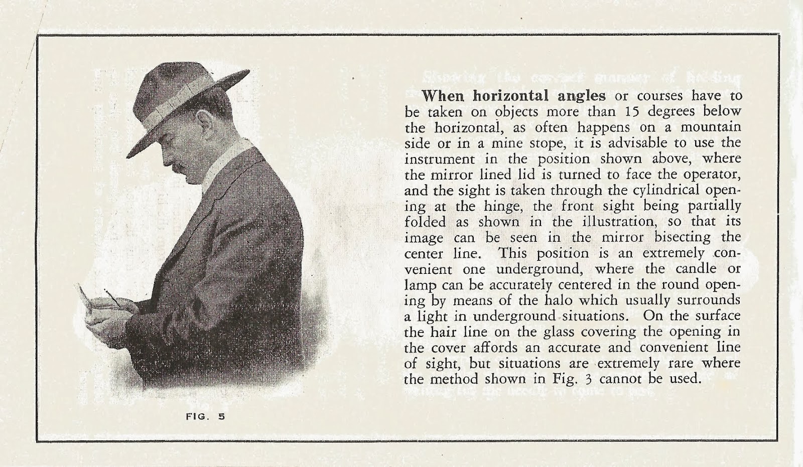 It’s an extremely useful little book, because it covers in some detail the different ways you can use the pocket transit, whether it’s shooting azimuths, reading horizontal or vertical angles, tracing a mineral vein or using the instrument as a clinometer or a plumb.