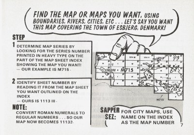 The DMA map catalogs were hundreds and hundreds of pages of small scale maps covered in teeny-tiny squares, each with a unique number. Each square represented an individual map, and you were expected to put on your reading glasses (or for the really cool intel types, pull the monocular magnifier out of the Photo Interpretation Kit) and start writing down the number for each and every map you need to order. Remember, no mistakes!