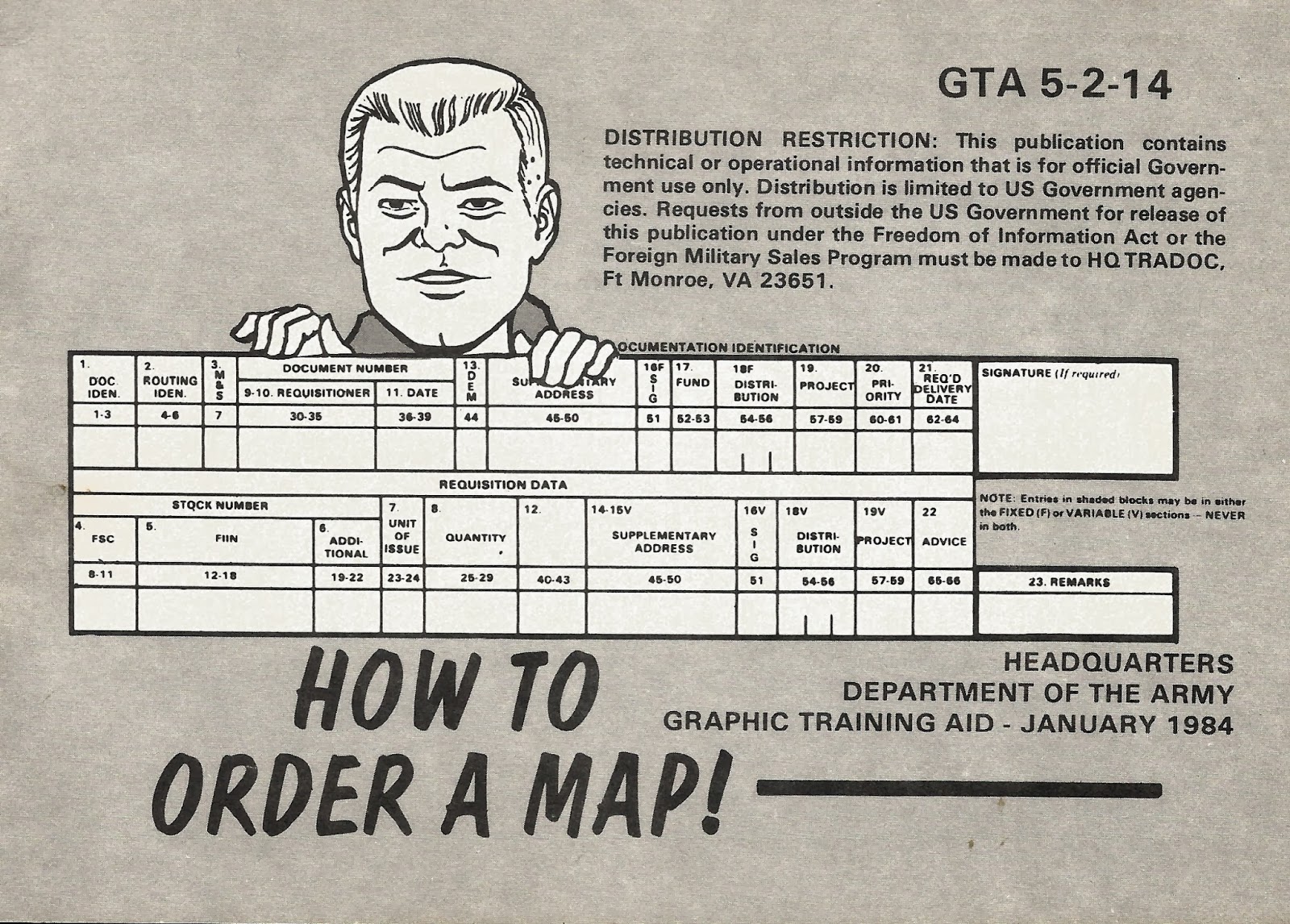 Well kids, we’ve come to the end of our class on ordering maps the Army way. This GTA makes it look easy, right? We’ll listen close and I’ll tell you how map requisition really worked at places like FT Bragg, FT Campbell, FT Hood and other major installations… you’d just drive over to the installation map warehouse and start banging your fist on the counter until the map distribution guys coughed up what you wanted. It also helped if they were in your company and they worked for you. I don’t think I used these ordering procedures more than once or twice in my whole career.