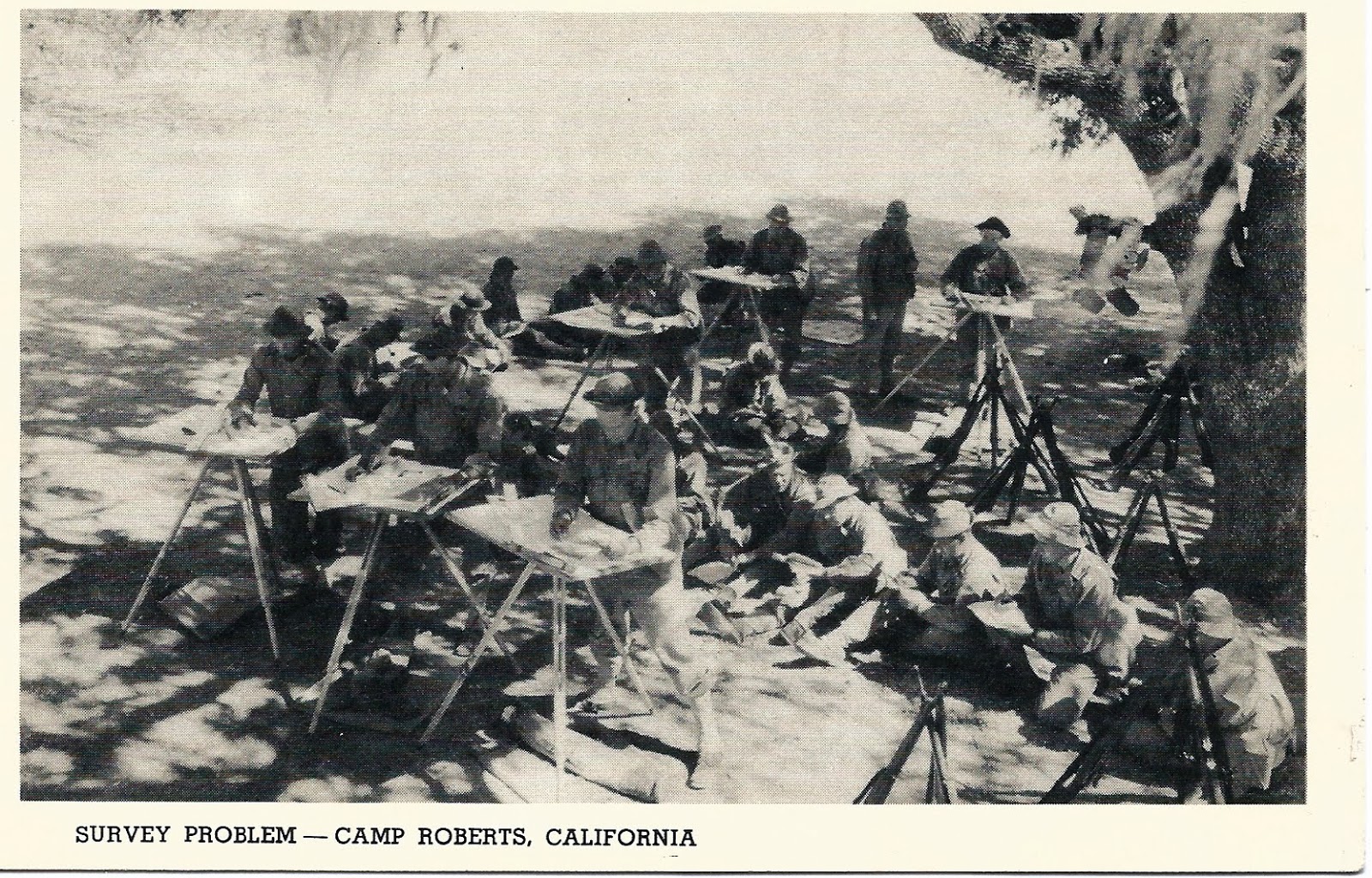 Next, I don’t think these Soldiers are ‘surveying’.  Since Camp Roberts was primarily an Infantry and Artillery training center my guess is that these are soldiers taking a class in Field Artillery plotting using plane tables.  Plane tables were a common item in Field Artillery battery TOEs, intended to be used as a field expedient plotting table.  I have one in my collection with the case stenciled ‘HQ FDC’ – Headquarters Fire Direction Center.  I have no idea which headquarters or which fire direction center, but clearly it was a piece of Field Artillery equipment (and identical to the plane tables used by Engineer survey units).  Another clue that this is a Field Artillery class is the use of large artillery plotting protractors.  You can just make them out on the plane tables in the foreground – large semi-circular protractors with a rotating plotting ruler mounted at the center.  Plus, there are no alidades visible, a key piece of equipment for any survey plane table work.