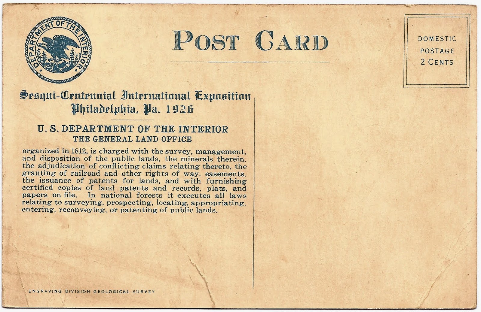 The exposition was a bust, going bankrupt in 1927.  But at least one Federal government agency got in on the celebration.  The General Land Office of the Department of the Interior issued this neat postcard: