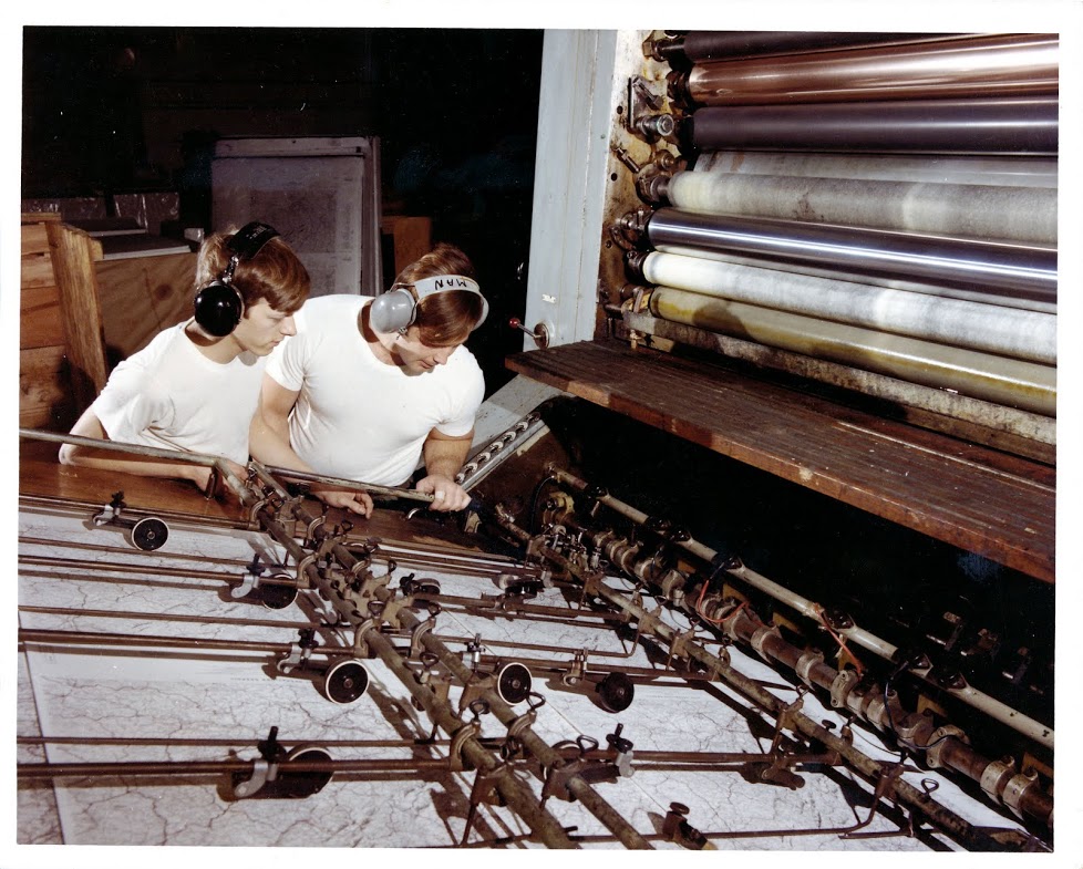 Here’s a photo of the feeder end of another one of the 649th’s large format presses. In this photo it looks like already printed map sheets are being fed back through the press to add another information layer or military overprint.